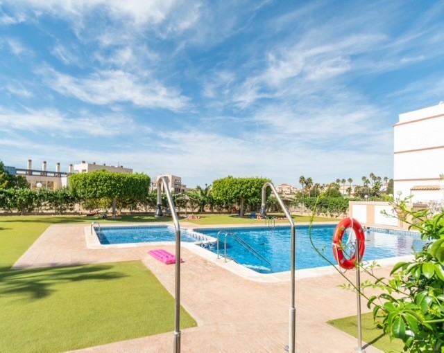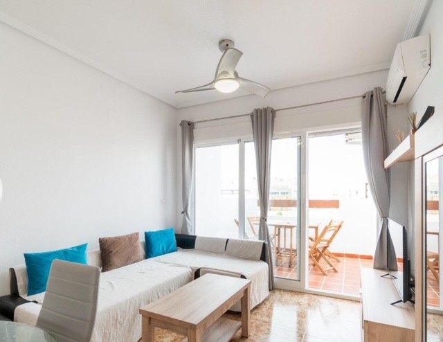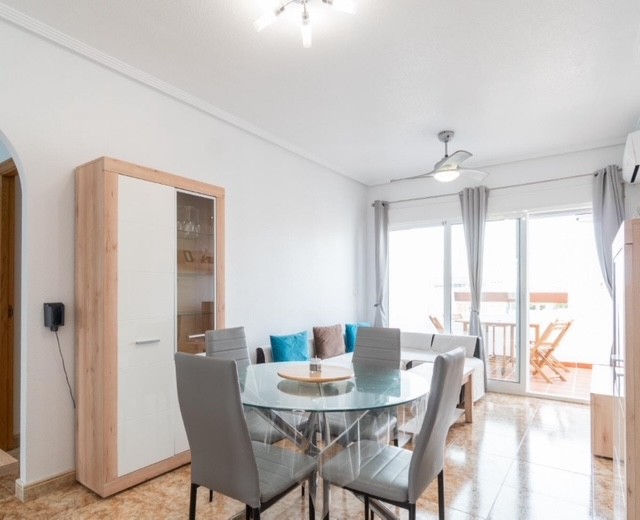 We present to you a lovely fully furnished apartment with bright living room, breakfast terrace and sun drenched roof solarium to enjoy as well as well maintained community pool and gardens. Ideal location to spend your holidays, justb a short walk to local shops, bars and restruants to choose from. Only a 10 mi9nu7tes waloook to Punta Marina commercial center and 25 minutes walk to the beautiful beaches. Lesss then a 10 minutes drive to La Zenia boulevard shopping center or to Villamartin golf course.