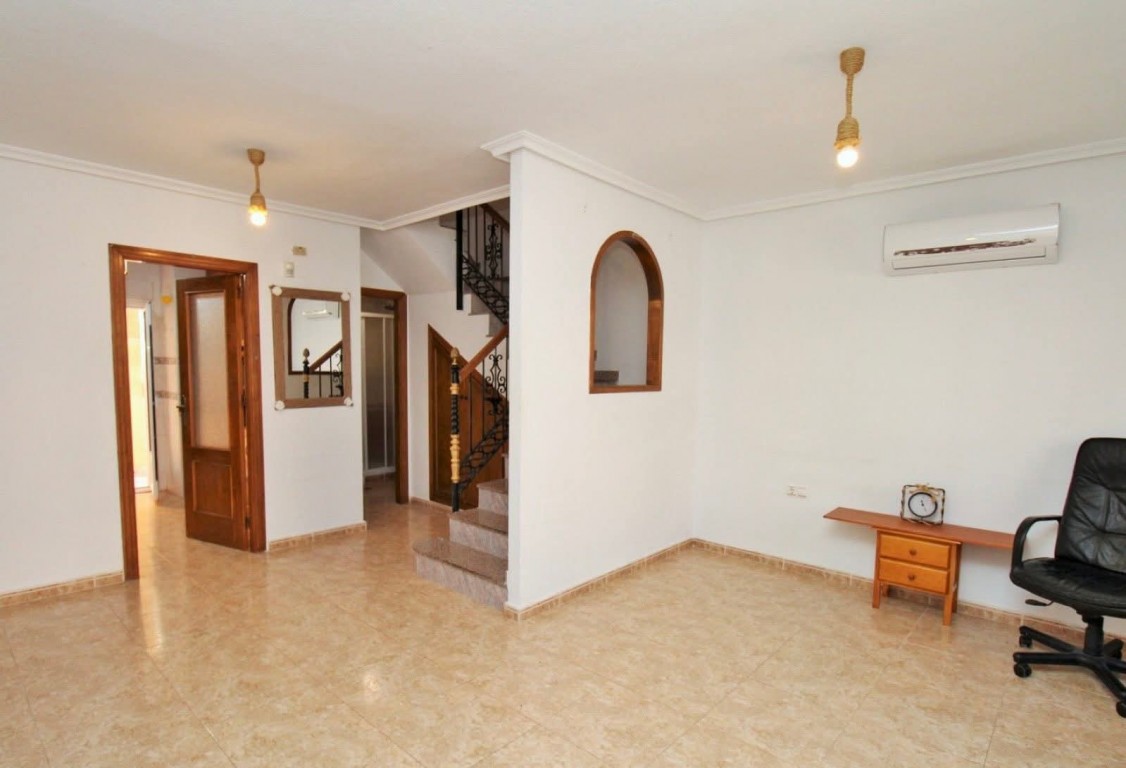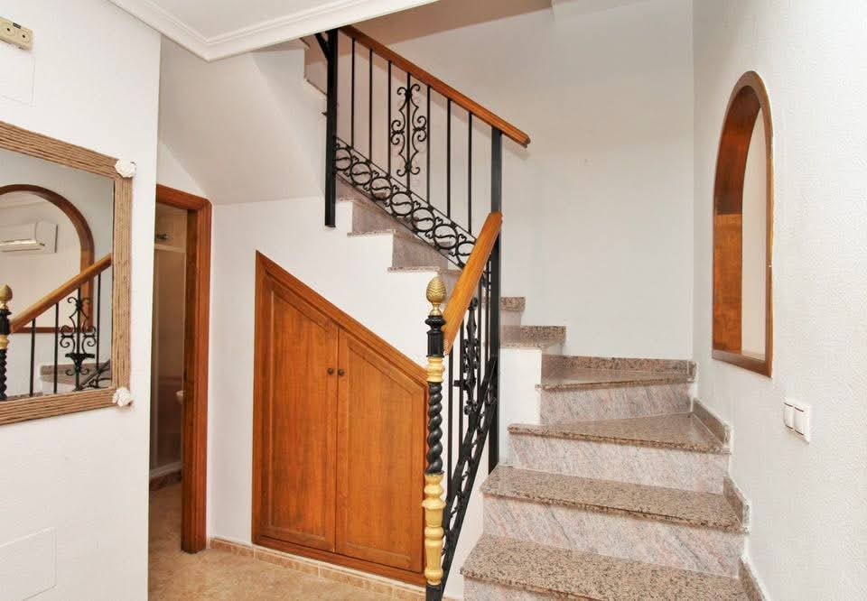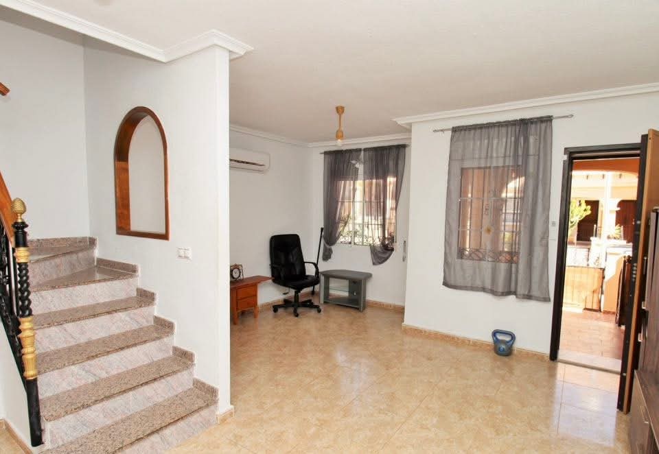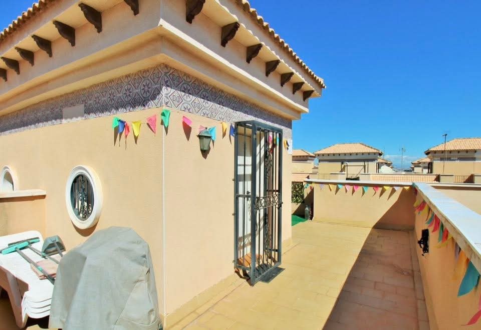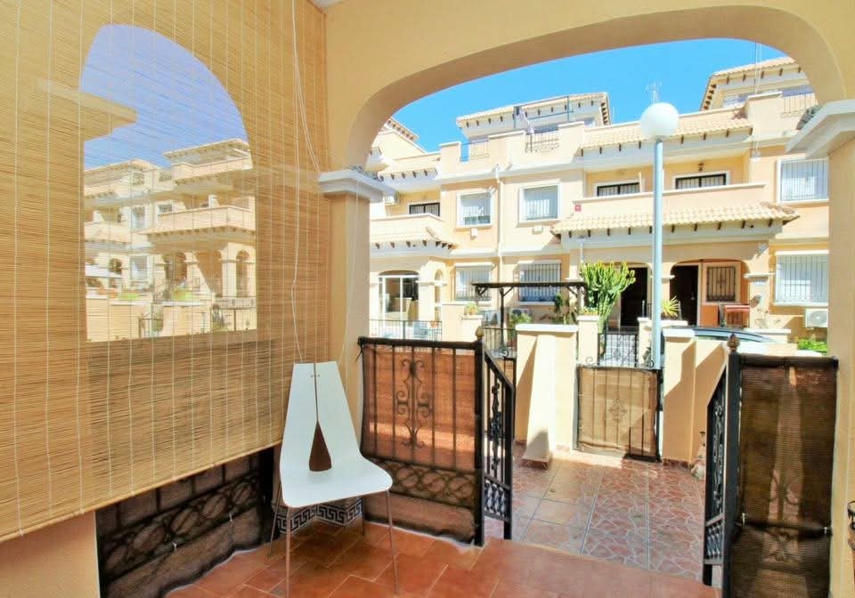 Introducing this charming 3-bedroom, 2-bathroom house located in the sought-after area of Villamartin, Orihuela Costa. This well-presented property offers a perfect combination of comfort, space, and Mediterranean living. The home features a bright and spacious living room, a separate fully equipped kitchen with appliances, and a convenient WC on the ground floor. Upstairs, you’ll find two double bedrooms with fitted wardrobes, including a master bedroom with access to a private sun terrace. The property also boasts a sunny roof solarium ideal for relaxing or entertaining, as well as a patio garden and private driveway. Partly furnished and equipped with air conditioning, this home is move-in ready and offers both practicality and charm. Situated within a well-maintained gated community, residents can enjoy beautifully kept gardens and a communal swimming pool. Ideally located close to all amenities, including shops, restaurants, and parks, and just a 5-minute drive to the stunning cove beaches, La Zenia Boulevard shopping centre, and several golf courses. Alicante Airport is only 45 minutes away, making this property ideal for full-time living, holidays, or investment.