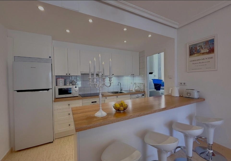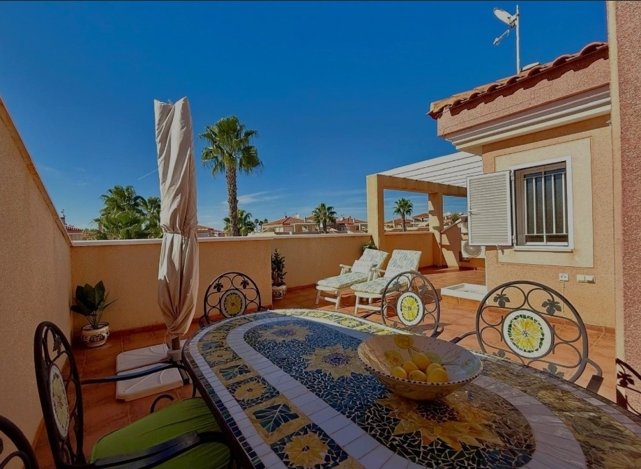 The property features a spacious open-plan living and dining area with an American-style kitchen that opens onto a generous balcony, ideal for outdoor dining or morning coffee. On the main level, you’ll find two double bedrooms with built-in wardrobes, a family bathroom, and a convenient laundry area. Upstairs, the landing has enough space for an additional double bed and leads to a second bathroom and a large private solarium that provides both sun and shade with exceptional privacy—perfect for sunbathing, entertaining, or simply enjoying the Mediterranean climate.
