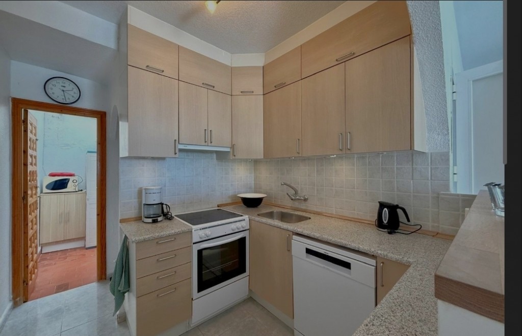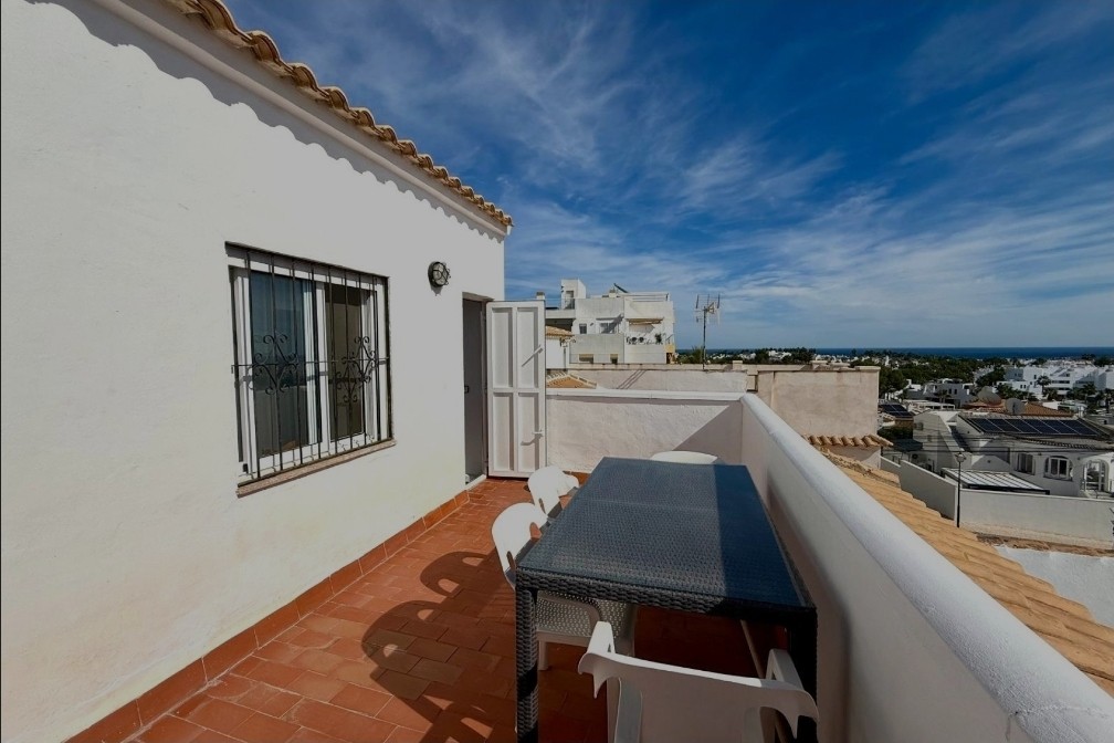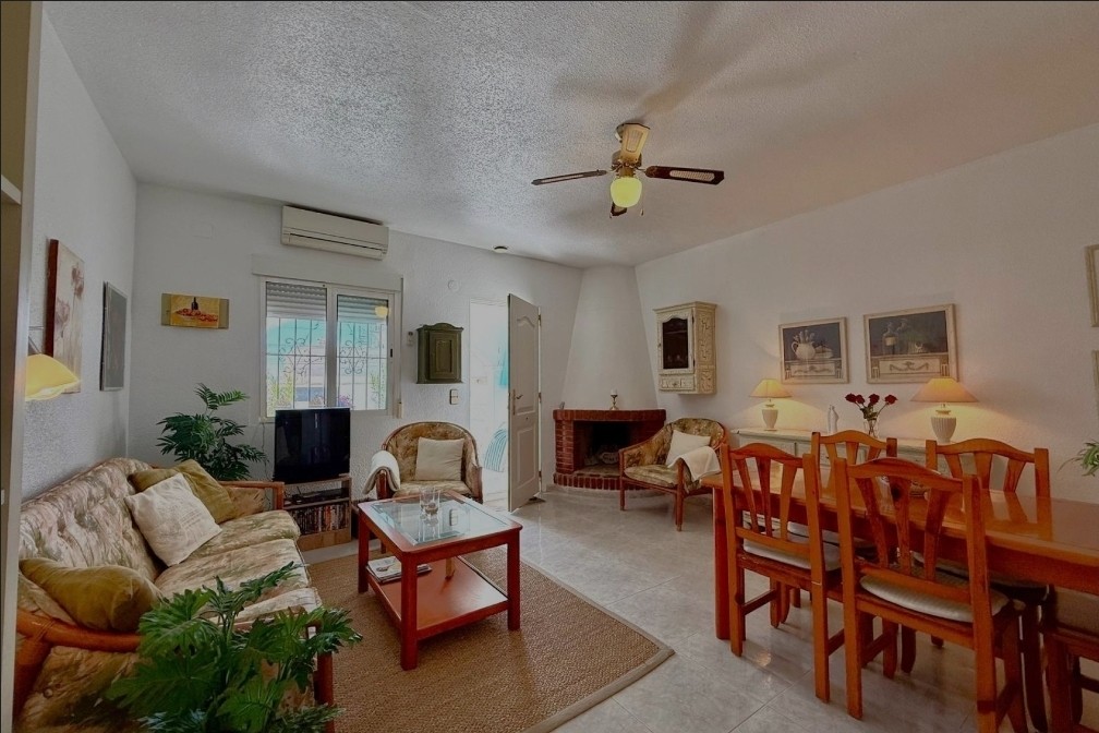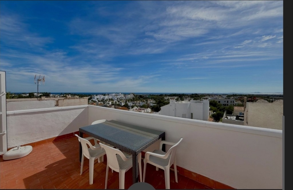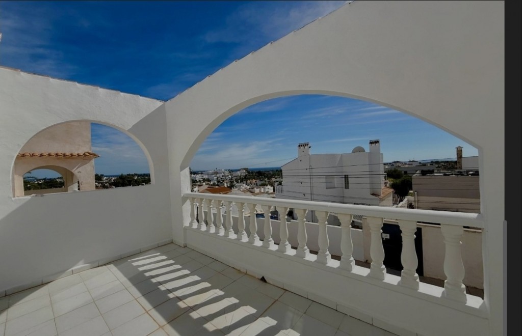 This well-maintained split-level townhouse offers 3 bedrooms, 2 bathrooms and a spacious 90m² layout with a bright south-facing orientation. The open-plan living and dining area includes a fireplace and leads to a separate American-style kitchen with an adjoining utility room. The home features built-in wardrobes, a sun terrace, and a large private solarium boasting panoramic sea views. Ideally located just 200 metres from amenities, 1 km from golf, 4 km from the beach, and 55 km from the airport, this property provides comfort, convenience and beautiful surroundings.