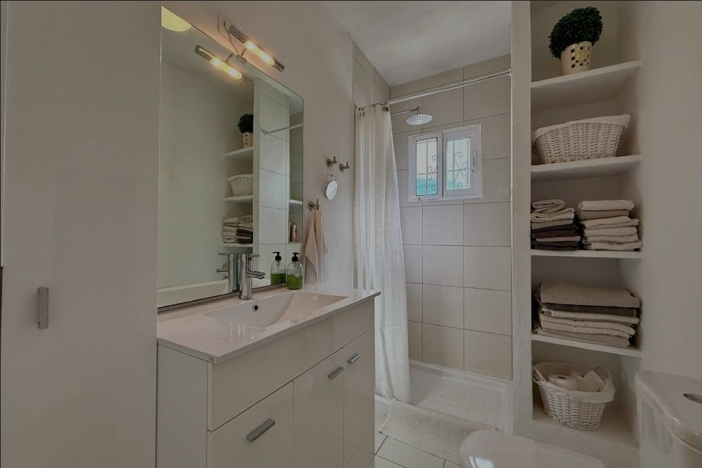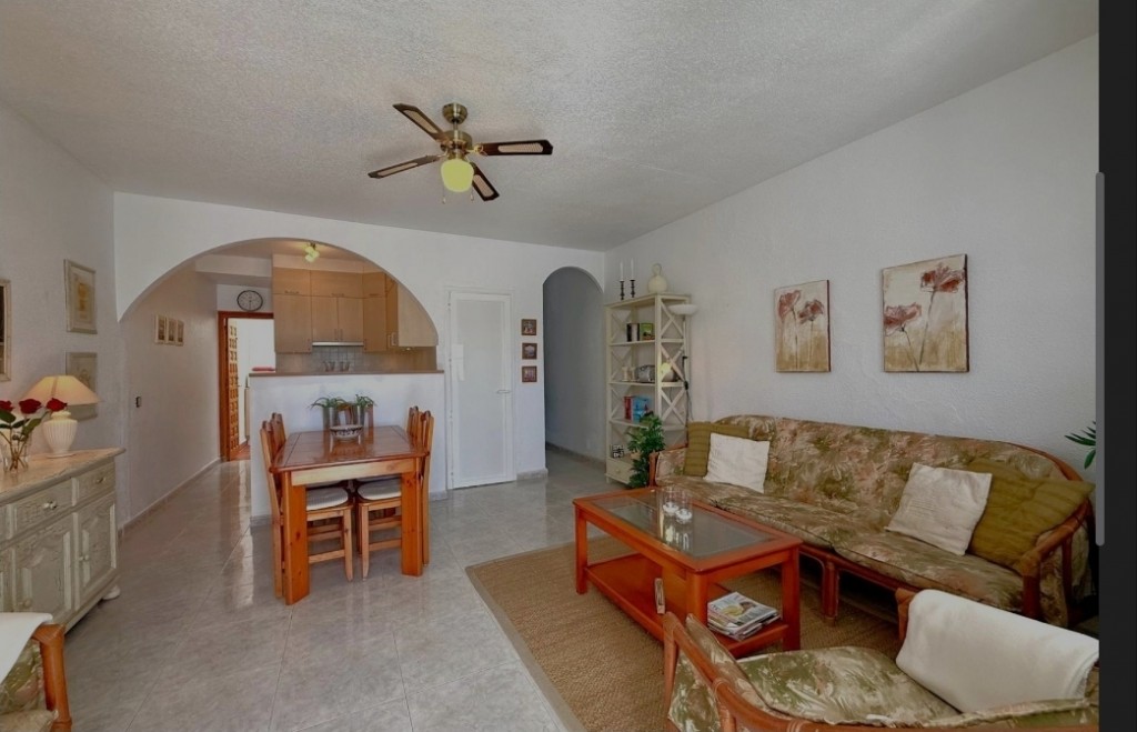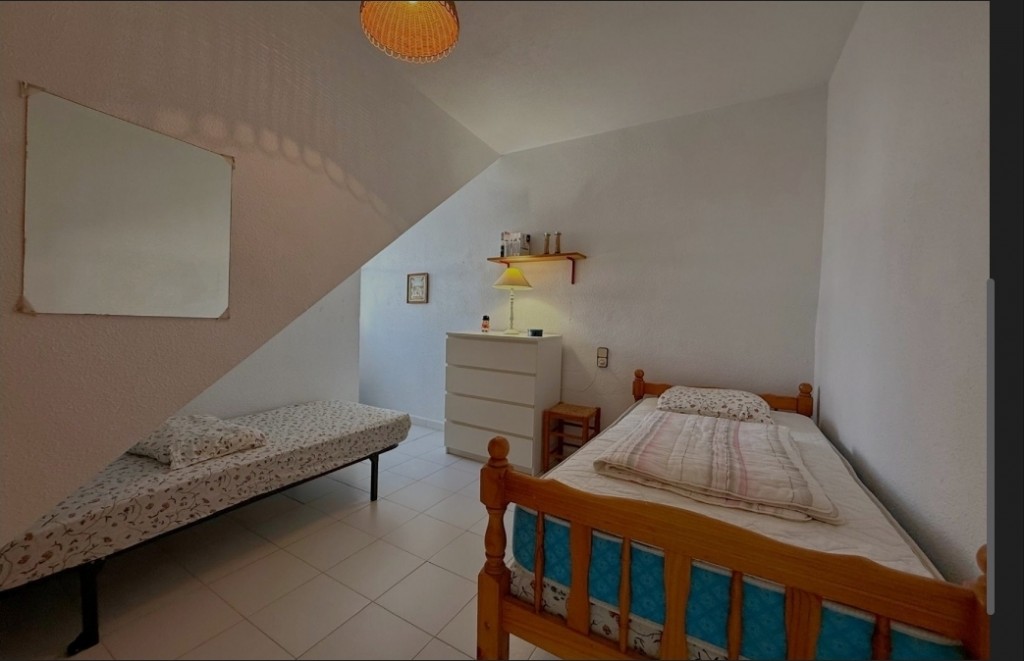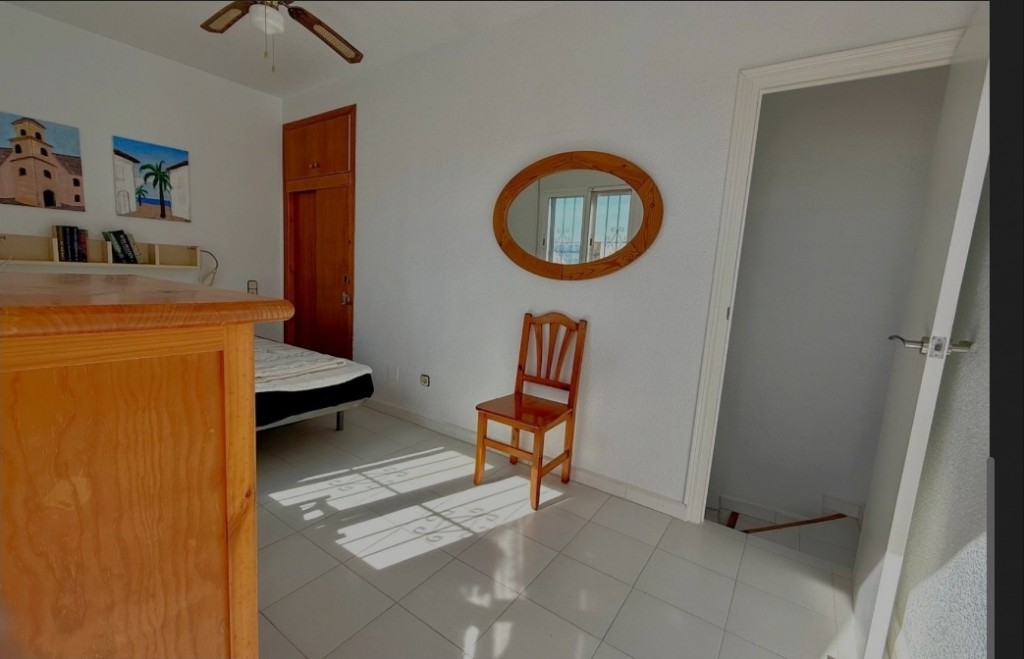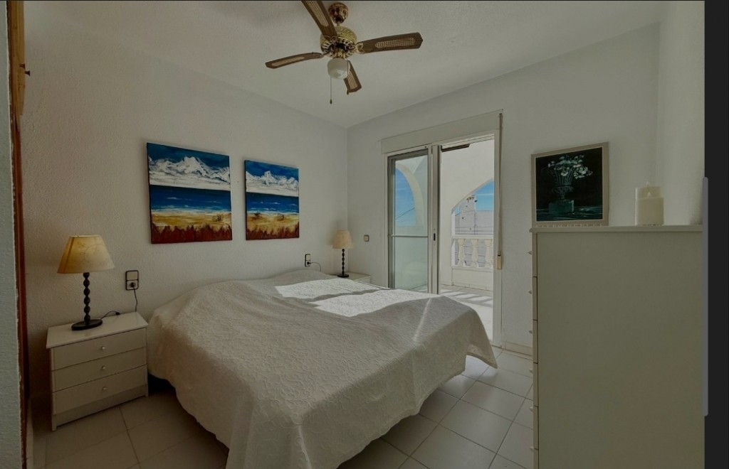 This well-maintained split-level townhouse offers 3 bedrooms, 2 bathrooms and a spacious 90m² layout with a bright south-facing orientation. The open-plan living and dining area includes a fireplace and leads to a separate American-style kitchen with an adjoining utility room. The home features built-in wardrobes, a sun terrace, and a large private solarium boasting panoramic sea views. Ideally located just 200 metres from amenities, 1 km from golf, 4 km from the beach, and 55 km from the airport, this property provides comfort, convenience and beautiful surroundings.