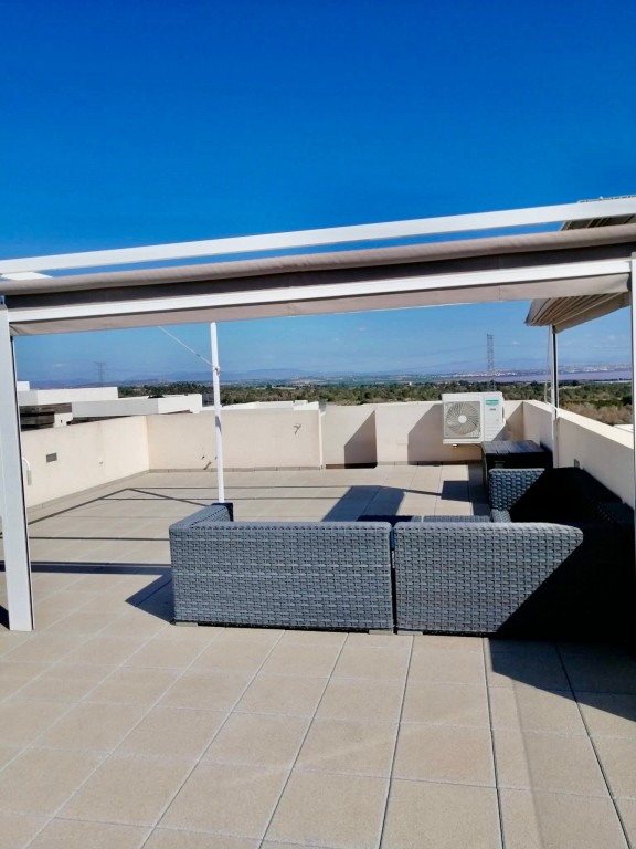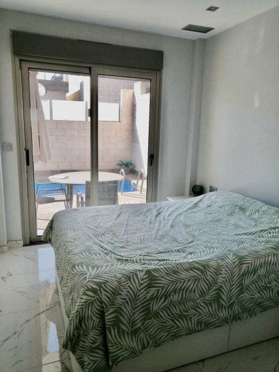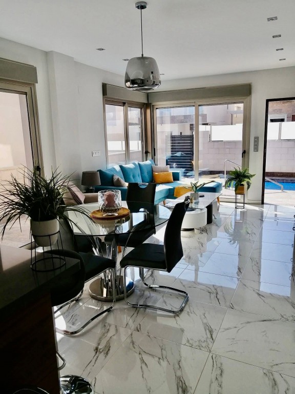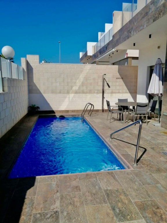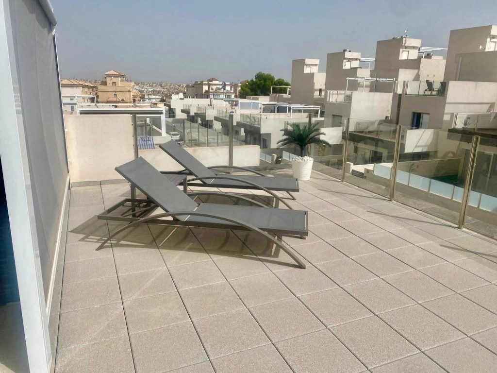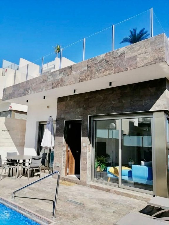 We present a beautifully modern, fully furnished 3 bedroom, 2 bathroom villa built in 2020, offering an immaculate interior and exceptional outdoor living. This south-facing property features a spacious patio surrounding the private pool and shower area, providing ample room for sun loungers and outdoor dining. Inside, the bright and airy open-plan living, dining, and kitchen area benefits from large sliding doors that open onto the garden. The fully fitted kitchen includes all appliances and a breakfast bar. The master bedroom, located at the front of the villa, offers fitted wardrobes, direct access to the pool area, and a modern en-suite with a walk-in shower. The remaining two double bedrooms also feature fitted wardrobes and sliding doors leading to the side garden, with a high-quality family bathroom situated between them. An exterior staircase leads to a large rooftop solarium with panoramic views across the Pink Salt Lakes and partial sea views, complete with a shaded chill-out area. The property also includes electric shutters and generous outdoor space. Located less than a 10-minute walk from local shops, bars, and restaurants, and only a short drive to La Zenia Boulevard, the beaches, Villamartin Plaza, and the golf course, this villa offers both luxury and convenience. Alicante and Murcia airports are within a 45-minute drive.