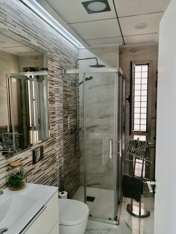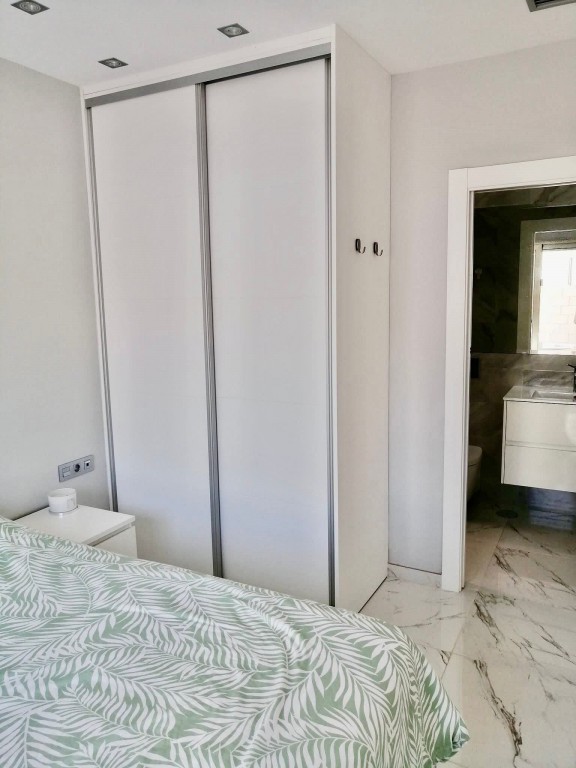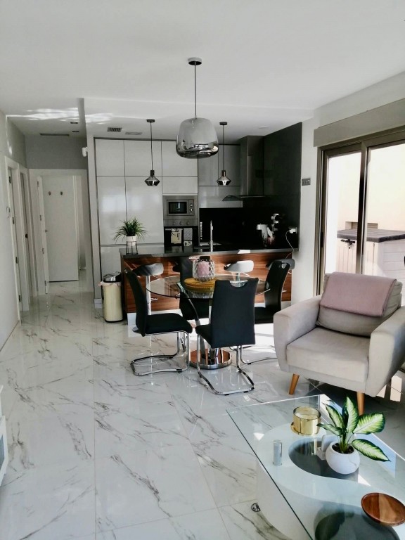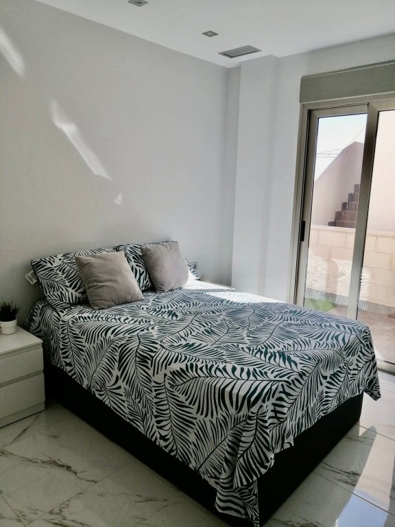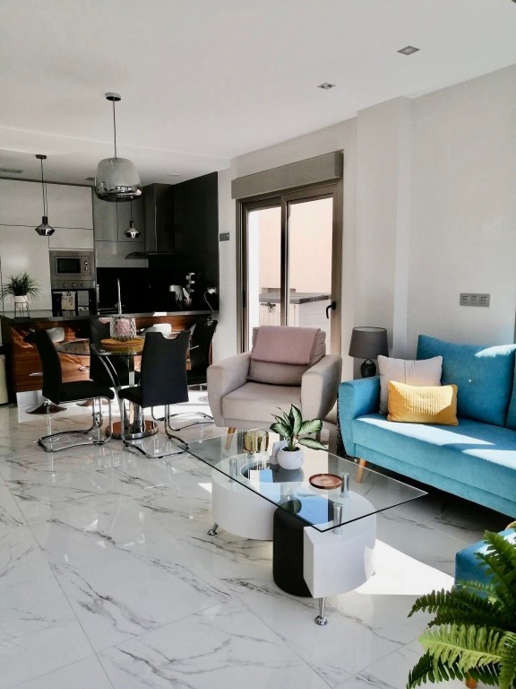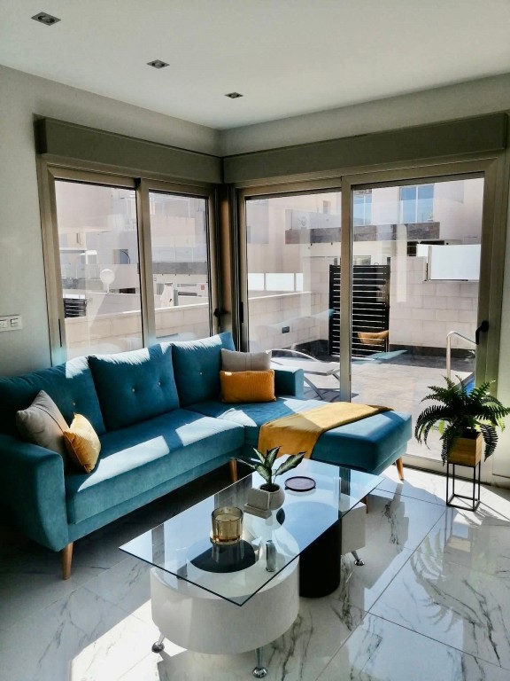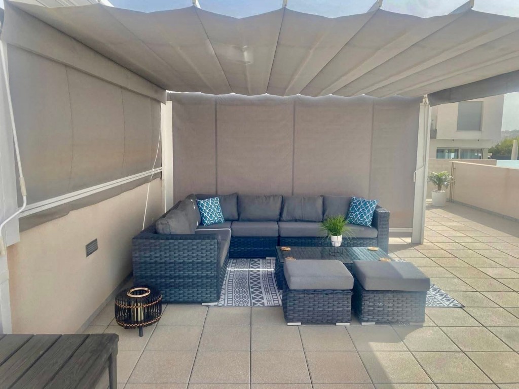 We present a beautifully modern, fully furnished 3 bedroom, 2 bathroom villa built in 2020, offering an immaculate interior and exceptional outdoor living. This south-facing property features a spacious patio surrounding the private pool and shower area, providing ample room for sun loungers and outdoor dining. Inside, the bright and airy open-plan living, dining, and kitchen area benefits from large sliding doors that open onto the garden. The fully fitted kitchen includes all appliances and a breakfast bar. The master bedroom, located at the front of the villa, offers fitted wardrobes, direct access to the pool area, and a modern en-suite with a walk-in shower. The remaining two double bedrooms also feature fitted wardrobes and sliding doors leading to the side garden, with a high-quality family bathroom situated between them. An exterior staircase leads to a large rooftop solarium with panoramic views across the Pink Salt Lakes and partial sea views, complete with a shaded chill-out area. The property also includes electric shutters and generous outdoor space. Located less than a 10-minute walk from local shops, bars, and restaurants, and only a short drive to La Zenia Boulevard, the beaches, Villamartin Plaza, and the golf course, this villa offers both luxury and convenience. Alicante and Murcia airports are within a 45-minute drive.