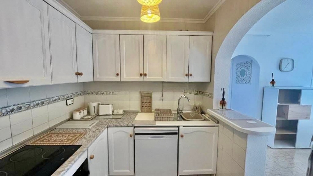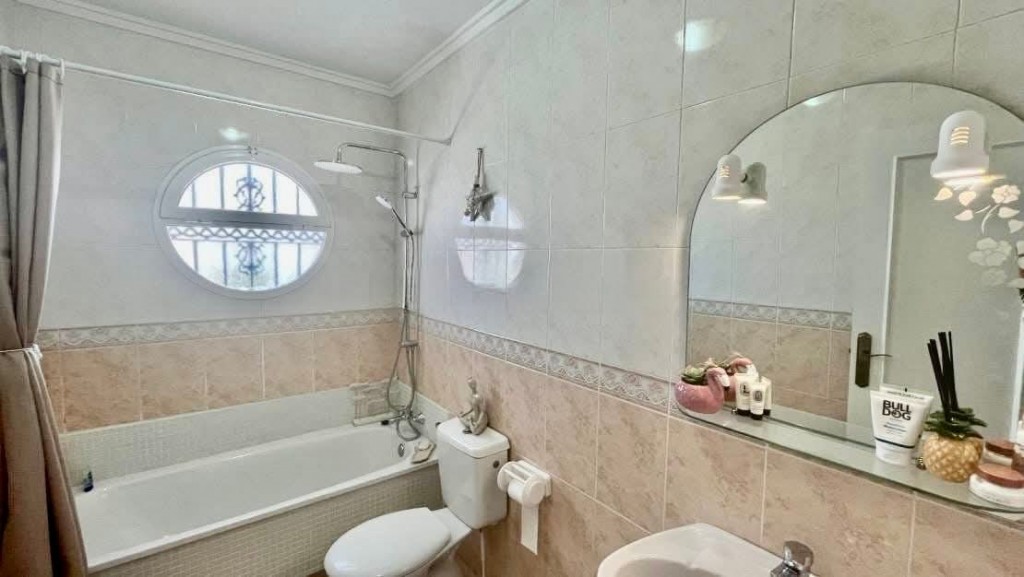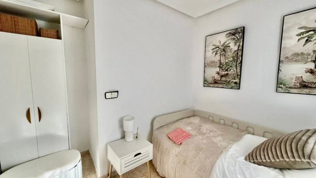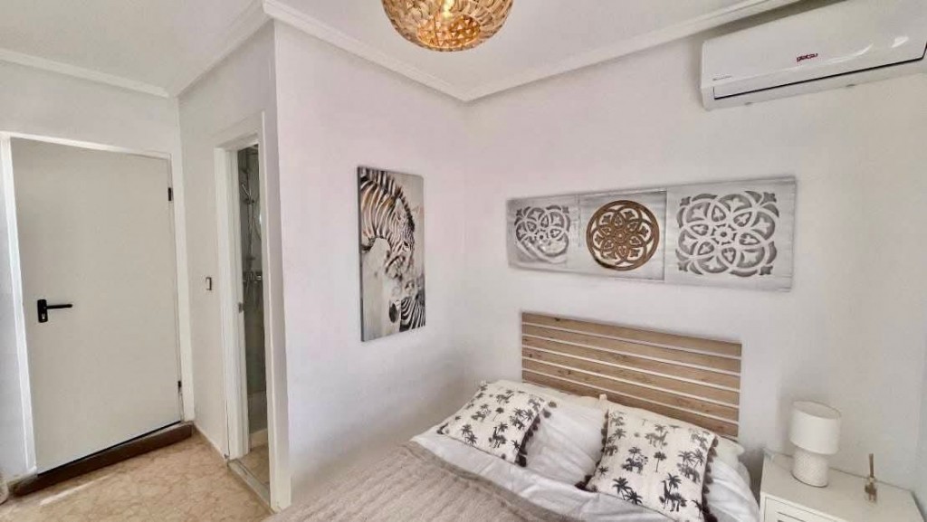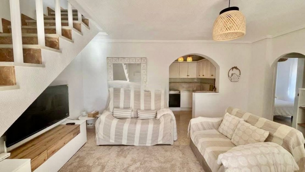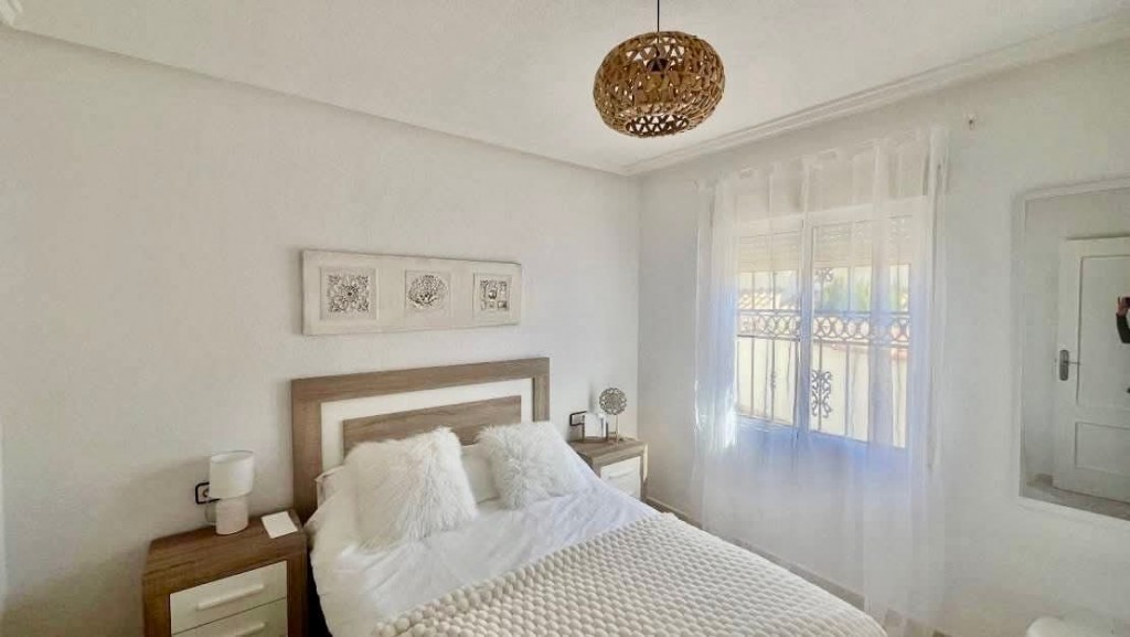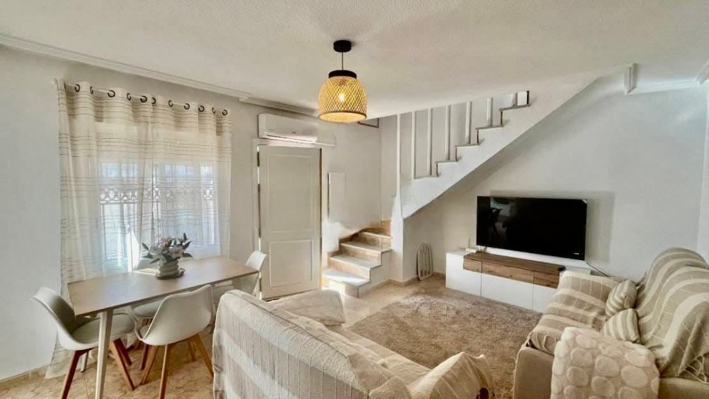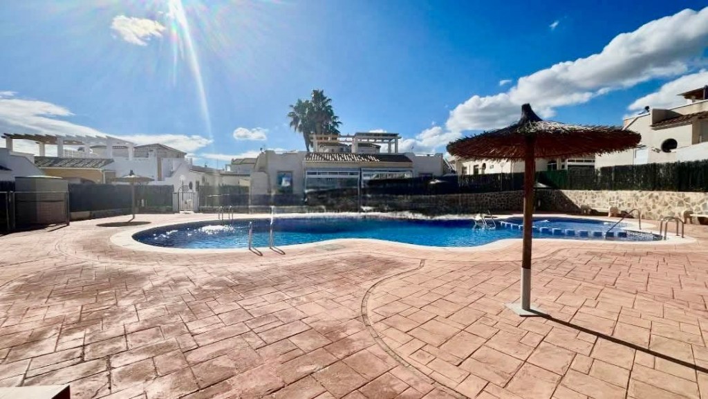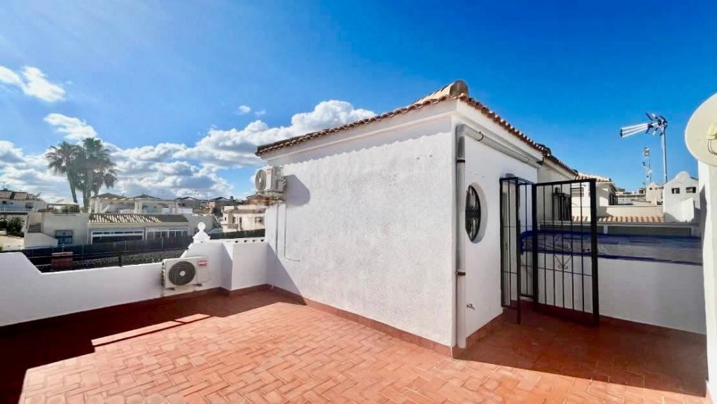 We present a sunny south-facing three-bedroom, two-bathroom quad villa in the heart of Punta Prima, offering sun terraces, a roof solarium, and access to a well-maintained community pool. The property features a spacious patio garden with room for a splash pool and comes partly furnished with air conditioning throughout. Inside, the bright living area flows into an open-plan kitchen with a breakfast bar. The ground floor includes two double bedrooms with fitted wardrobes and a shower room, while the master bedroom is situated on the upper level, complete with wardrobe space and direct access to the sun-drenched roof solarium. The property benefits from free parking and is ideally located for permanent living or holidays. It is just a five-minute walk to a wide selection of shops, bars, and restaurants, a ten-minute walk to the beautiful nearby beaches, and close to a convenient bus route into Torrevieja town centre. La Zenia Boulevard is only a short drive away, and both the community fee (€300 per year) and Suma (€200 per year) offer excellent value. Alicante Airport is approximately a 45-minute drive.