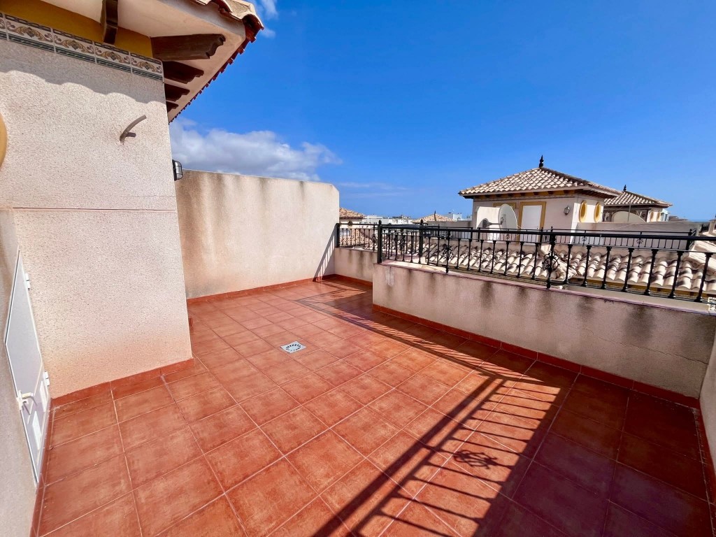 We present a beautiful, sunny south-facing 3 bedroom quad villa with 1 bathroom, 1 WC, multiple sun terraces, roof solarium, patio garden, driveway and access to a gated community pool and gardens, situated just a 10-minute walk from the popular La Zenia Boulevard shopping centre. The property is fully furnished and equipped, offering a bright living room, open-plan kitchen with breakfast bar, ceiling fans, air conditioning, a double bedroom and WC on the ground floor, plus two additional bedrooms and a bathroom on the upper level. With plenty of outdoor space including breakfast terrace, patio garden, upper terraces and a private rooftop solarium, this home is ideal for permanent living or holidays, set in a prime location close to all amenities and only 45 minutes from Alicante Airport. Secure this property online today with a refundable €5,000 deposit and buy from anywhere in the world.