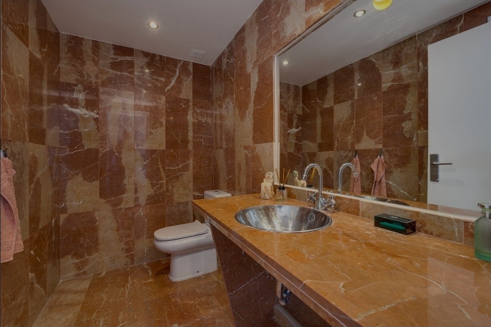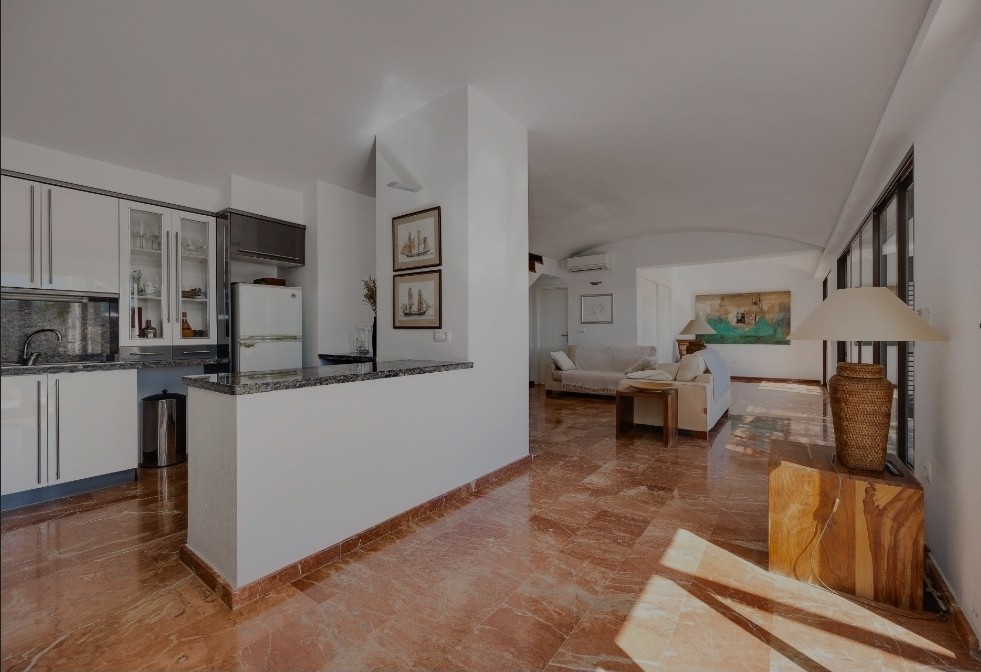 WE PRESENT TO YOU an exclusive, fully furnished duplex penthouse built in 2000 with top-quality materials and in excellent condition, ready to move straight into and ideally positioned frontline to the prestigious Las Ramblas golf course in a peaceful and secure setting. This bright corner property is completely exterior and offers spectacular open views over the golf course, greenery and even the Mediterranean Sea. The main level features a spacious and luminous living–dining room with a fireplace, an open-plan fully equipped kitchen, a cosy reading area (originally a third bedroom), a double bedroom with fitted wardrobes and an en-suite bathroom, plus a guest WC. Upstairs you will find a second en-suite bedroom with direct access to a huge private roof solarium, perfect for sunbathing, entertaining and enjoying the stunning views. The property also benefits from large terraces, air conditioning, fitted wardrobes, appliances, barbecue area, and parking, and is surrounded by golf courses, shops, restaurants, commercial centres and green areas, with La Fuente commercial centre just a 10-minute walk away. An optional closed garage space of 25m² is available for an additional €15,000.