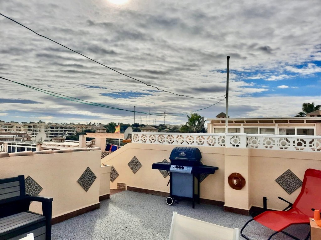 €195,000 EURO. We present to you this wonderful two bedroom immaculate house situated in the highly sought-after Montegolf area of Villamartin, Orihuela Costa. Located on a quiet street with off-road parking, this well-maintained property is both north and south facing and offers a bright and spacious living room with a cosy fireplace, an open-plan kitchen fully equipped with appliances, a utility room, glazed breakfast terrace, bathroom, and two double bedrooms both with fitted wardrobes. The property is partly furnished, benefits from air conditioning units throughout, additional storage space, and a sun-drenched roof solarium offering lovely open views. Residents can enjoy a large communal pool and park area, and the location is ideal, within walking distance to Villamartin Plaza and La Fuente commercial centre, as well as shops, bars, restaurants and close to several golf courses. Just 45 minutes from both Alicante and Murcia airports, this property is perfect as a permanent home, holiday retreat or rental investment.